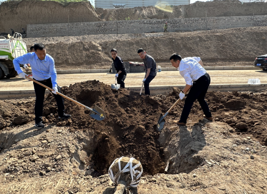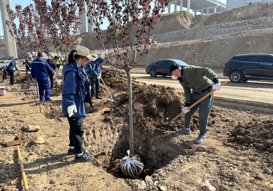 植物現場,大家三兩成組,戴好手套、揮鍬挖坑、扶樹正苗、澆水定根,配合默契、銜接有序,現場一派熱火朝天、辛勤勞動的景象。
