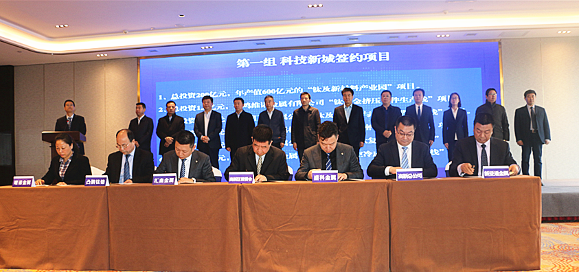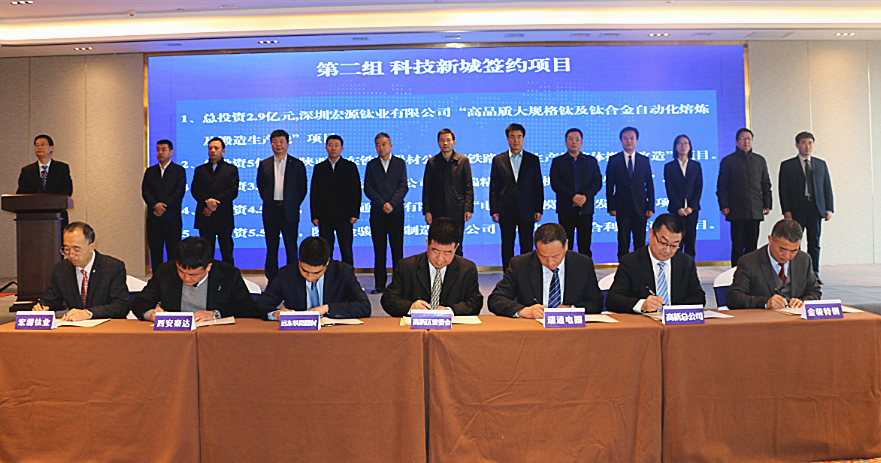 高新區管委會副主任王海峰,高新技術產業開發總公司董事長,與維諾金屬材料董事長,匯鑫金屬有限公司總經理,陜西凸鵬鈦鋯有限公司董事長,盛科新金屬有限公司總經理,新亞通金屬有限公司總經理簽約。