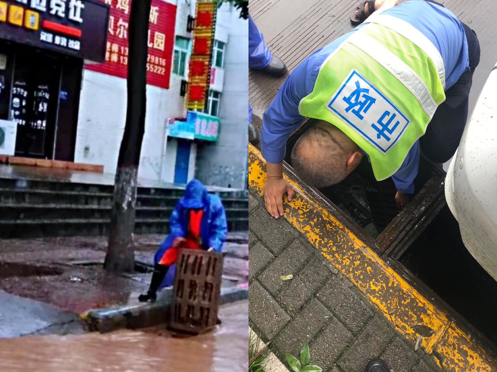 在這些視頻或照片中,環衛工們有的在暴雨中徒手清理堵塞的排水口,