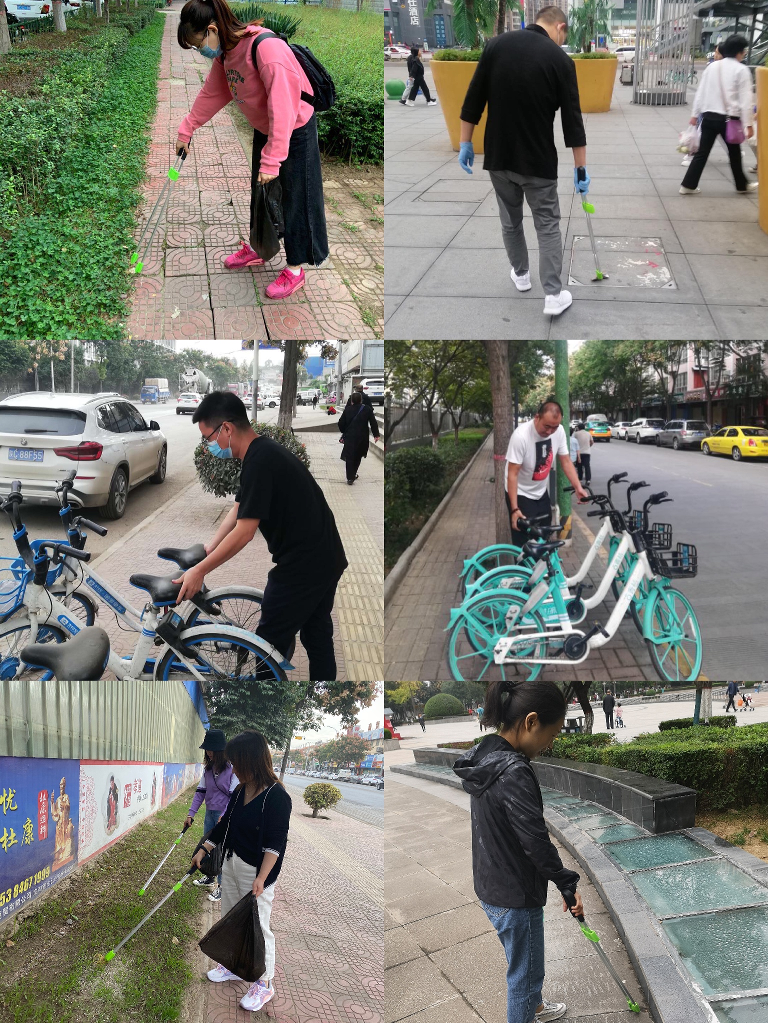 高新人力資源公司、寶雞鈦谷新材料公司及高新園林環衛公司員工撿拾街道垃圾,將共享單車有序擺放。