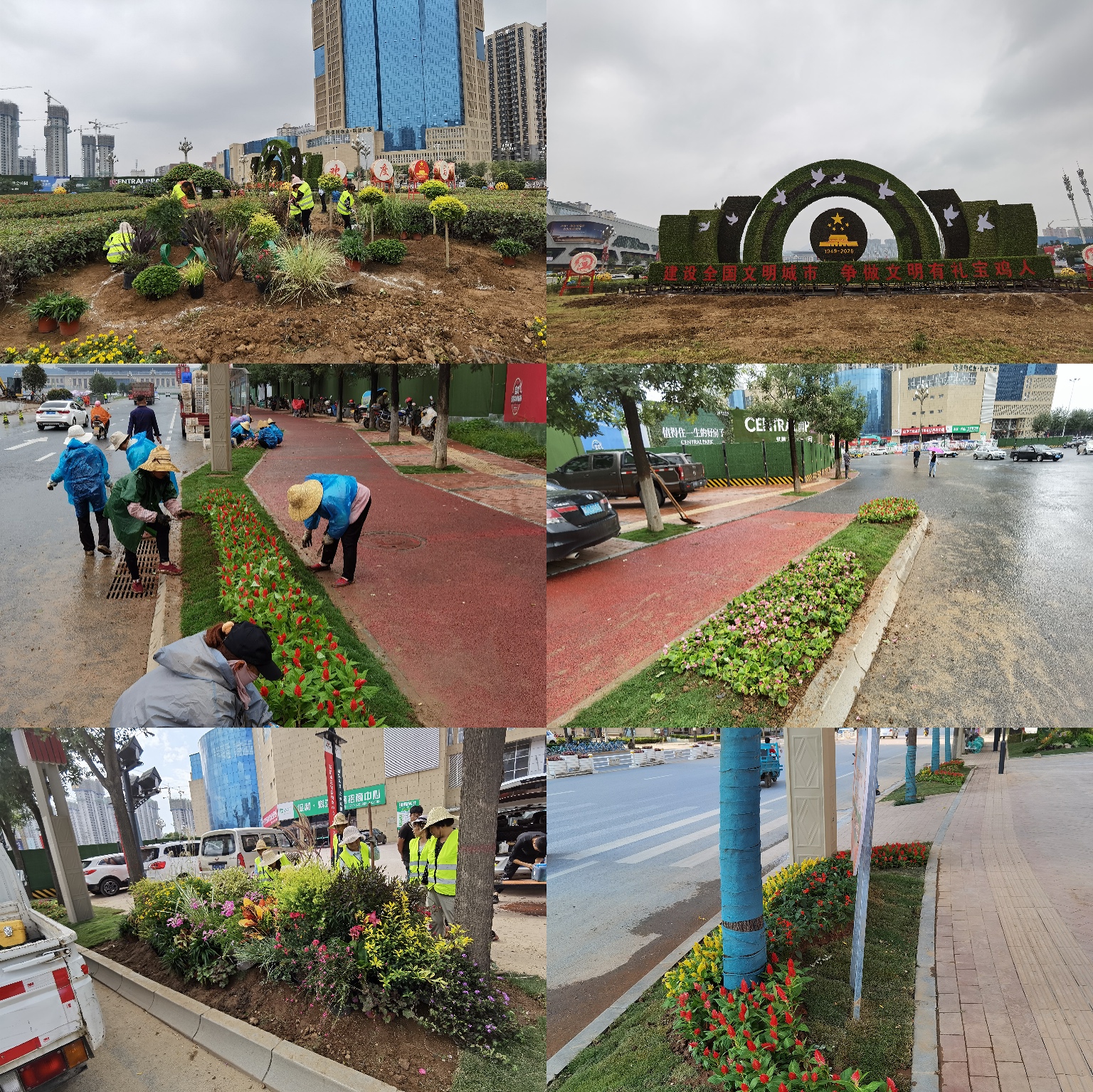 高新基建公司在高新五路轉盤及兩側綠化帶,南站噴泉廣場東西路節點整理地形,鋪草皮,種植時令花卉等。