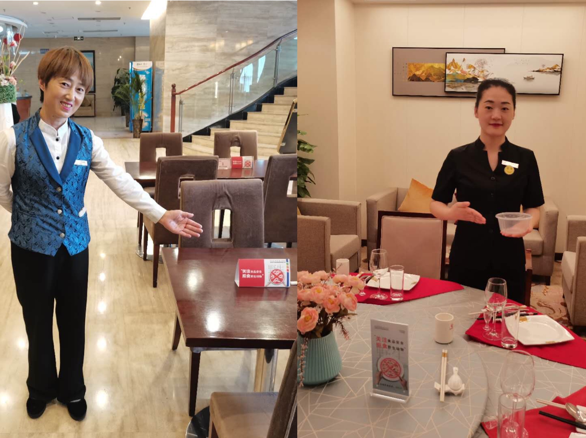 高新君悅酒店對所有用餐的顧客在餐前提示使用公筷公勺、適當點餐、提供免費打包盒。