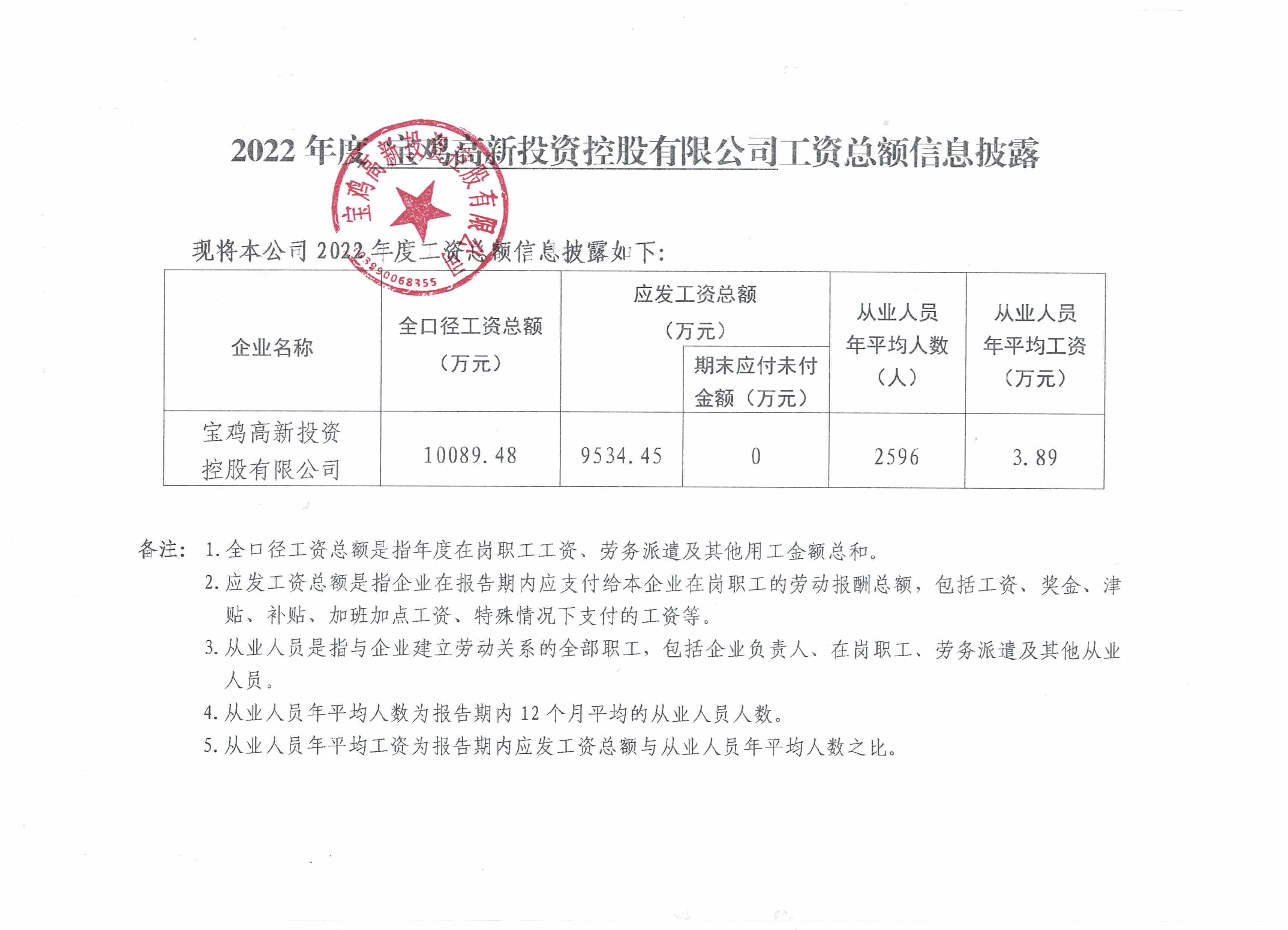 2022年度寶雞高新投資控股有限公司工資總額信息披露